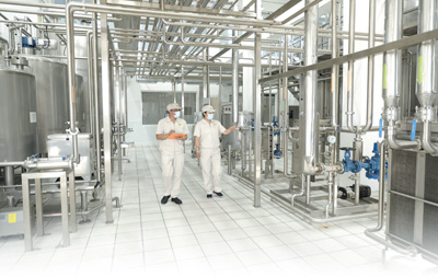哈薩克斯坦金駱駝奶粉加工廠內(nèi),員工正在操作設(shè)備。