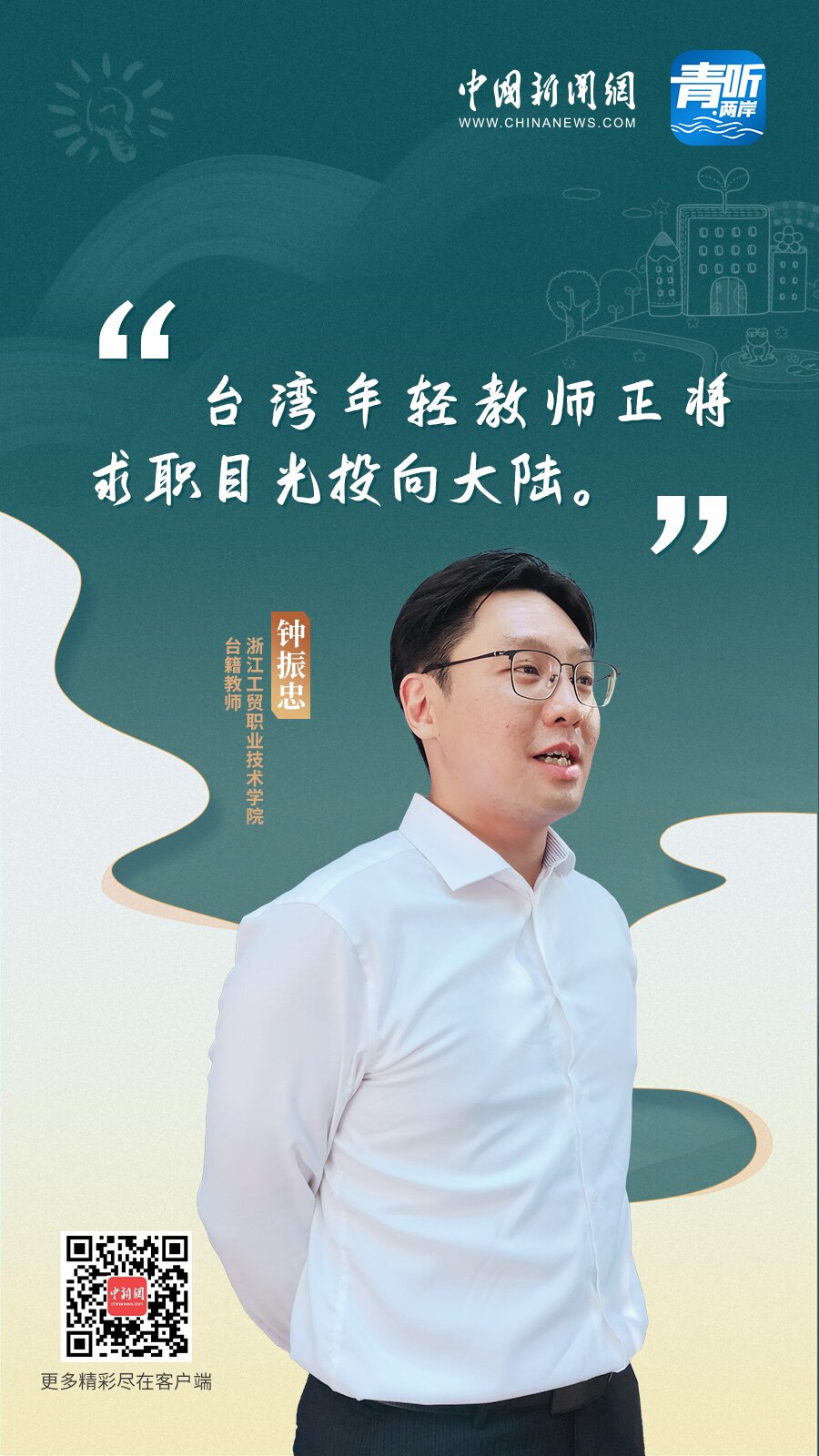 中新網(wǎng)9月10日電 (記者 程子倬 陳文韜)如今,越來越多的臺籍教師擁抱大陸發(fā)展機遇,赴大陸任教、立業(yè)筑夢,融入當?shù)厣?。近日,在中國新聞網(wǎng)《青聽·兩岸》節(jié)目中,幾位在大陸不同教育機構(gòu)任職的臺灣青年教師分享了各自融入大陸教育行業(yè)的故事,以及他們對大陸教育事業(yè)的觀察。