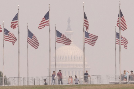6月29日,在美國首都華盛頓,游客在華盛頓紀(jì)念碑游覽,遠(yuǎn)處的國會大廈籠罩在煙霧中。新華社發(fā)(亞倫攝)