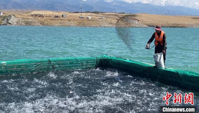 9月9日,記者來(lái)到位于新疆伊犁尼勒克縣喀拉蘇鄉(xiāng)的三文魚(yú)養(yǎng)殖基地。圖為養(yǎng)殖工向網(wǎng)箱中的虹鱒魚(yú)拋撒餌料。中新社記者 朱賀 攝