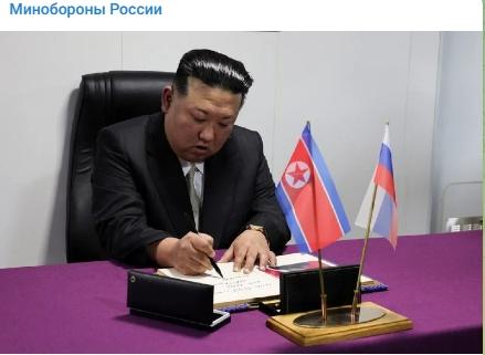 當(dāng)?shù)貢r(shí)間16日,金正恩在俄“沙波什尼科夫元帥”號(hào)護(hù)衛(wèi)艦貴賓簿上留言。圖片來源:俄國(guó)防部社交媒體截圖