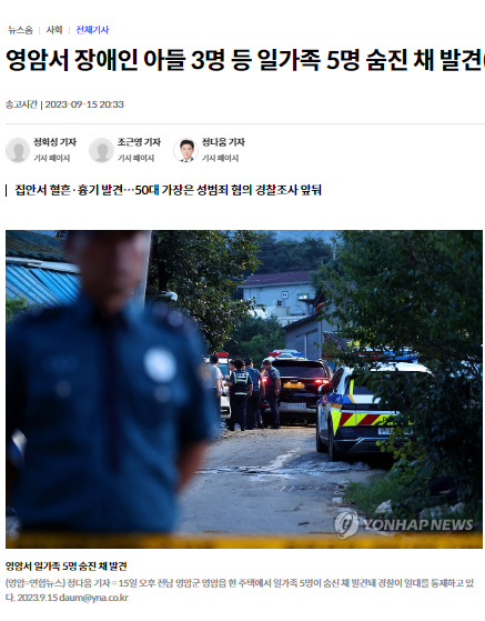中新網(wǎng)9月15日電 據(jù)韓聯(lián)社報道,當?shù)貢r間15日下午,韓國全羅南道靈巖郡一家五口在家中同時身亡,現(xiàn)場到處都是血跡。
