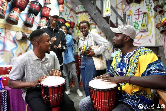 圖為選手在非洲手鼓店一起表演。人民網(wǎng) 盧鵬宇攝