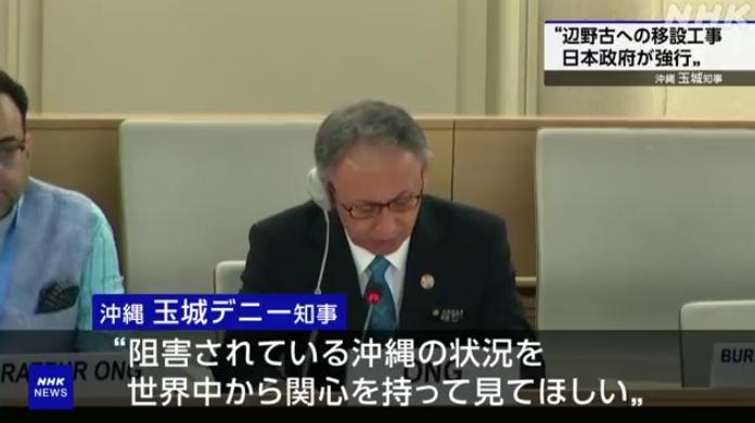 當?shù)貢r間18日,日本沖繩縣知事玉城丹尼在瑞士日內(nèi)瓦召開的聯(lián)合國人權理事會上,抨擊美日政府不顧沖繩民眾民意強行推進美軍基地搬遷。圖片來源:日本放送協(xié)會(NHK)視頻截圖