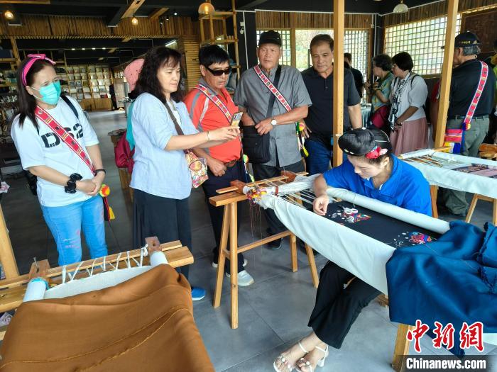 9月17日,來自臺灣花蓮縣光復(fù)鄉(xiāng)的村民在貴州西江千戶苗寨參觀苗繡制作。 邱軼軻 攝