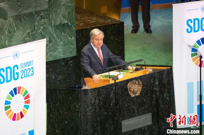 當(dāng)?shù)貢r間9月18日,聯(lián)合國可持續(xù)發(fā)展目標(biāo)峰會在紐約聯(lián)合國總部拉開帷幕。當(dāng)天,聯(lián)大通過一項(xiàng)政治宣言,會員國承諾加速實(shí)現(xiàn)2030年可持續(xù)發(fā)展目標(biāo)。圖為聯(lián)合國秘書長古特雷斯發(fā)表講話。 中新社記者 王帆 攝
