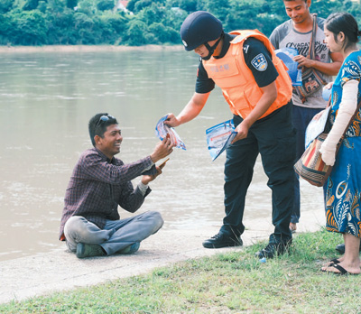 聯(lián)合巡邏執(zhí)法編隊(duì)執(zhí)法人員向沿岸民眾開(kāi)展禁毒宣傳。