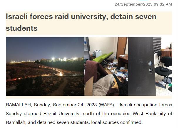 據(jù)報(bào)道,消息人士稱,以軍在突襲比爾宰特大學(xué)并破壞該校的物品和財(cái)產(chǎn)后,逮捕了7名學(xué)生,其中包括一名前囚犯。