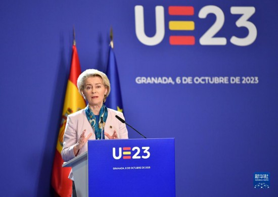 10月6日,在西班牙南部城市格拉納達,歐盟委員會主席馮德萊恩在歐盟領(lǐng)導(dǎo)人非正式會議后舉行的新聞發(fā)布會上講話。新華社記者連漪攝