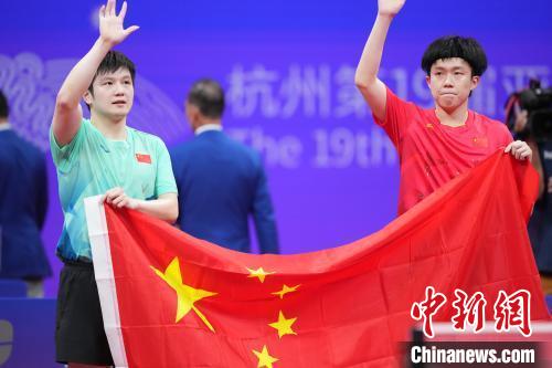 10月2日,杭州第19屆亞運(yùn)會乒乓球男子單打決賽在拱墅運(yùn)河體育公園體育館舉行,中國選手王楚欽4比3戰(zhàn)勝隊(duì)友樊振東,獲得冠軍。圖為王楚欽(右)與樊振東在賽后手持國旗向觀眾致意?!≈行律缬浾?田博川 攝