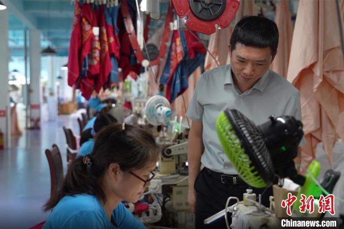 8月28日,“臺(tái)二代”、湖南富麗真金家紡有限公司總經(jīng)理杜俊毅(右)在車間與員工交流?!钍篮?攝