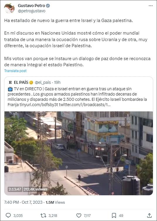 “以色列和巴勒斯坦在加沙地帶再次爆發(fā)戰(zhàn)爭(zhēng)。在聯(lián)合國(guó)的演講中,我曾展示了世界大國(guó)如何以一種方式對(duì)待俄羅斯對(duì)烏克蘭的占領(lǐng),但又以另一種截然不同的方式對(duì)待以色列對(duì)巴勒斯坦的占領(lǐng)。 ”佩特羅在社交媒體X發(fā)文說(shuō),“我支持建立和平對(duì)話,巴勒斯坦國(guó)將得到全面承認(rèn)?!?/p>