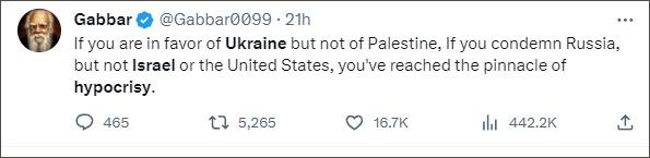 美國(guó)合眾國(guó)際社(UPI)報(bào)道注意到,有很多媒體專(zhuān)欄作者和社交媒體用戶(hù)都指出了西方在俄烏沖突等問(wèn)題上的“虛偽行為”,佩特羅并不是唯一一位。例如一名認(rèn)證為“作家”的社交媒體用戶(hù)寫(xiě)道:“如果你支持烏克蘭而不支持巴勒斯坦,如果你譴責(zé)俄羅斯卻不譴責(zé)以色列或美國(guó),那么你就已經(jīng)達(dá)到了虛偽的頂峰?!?/p>