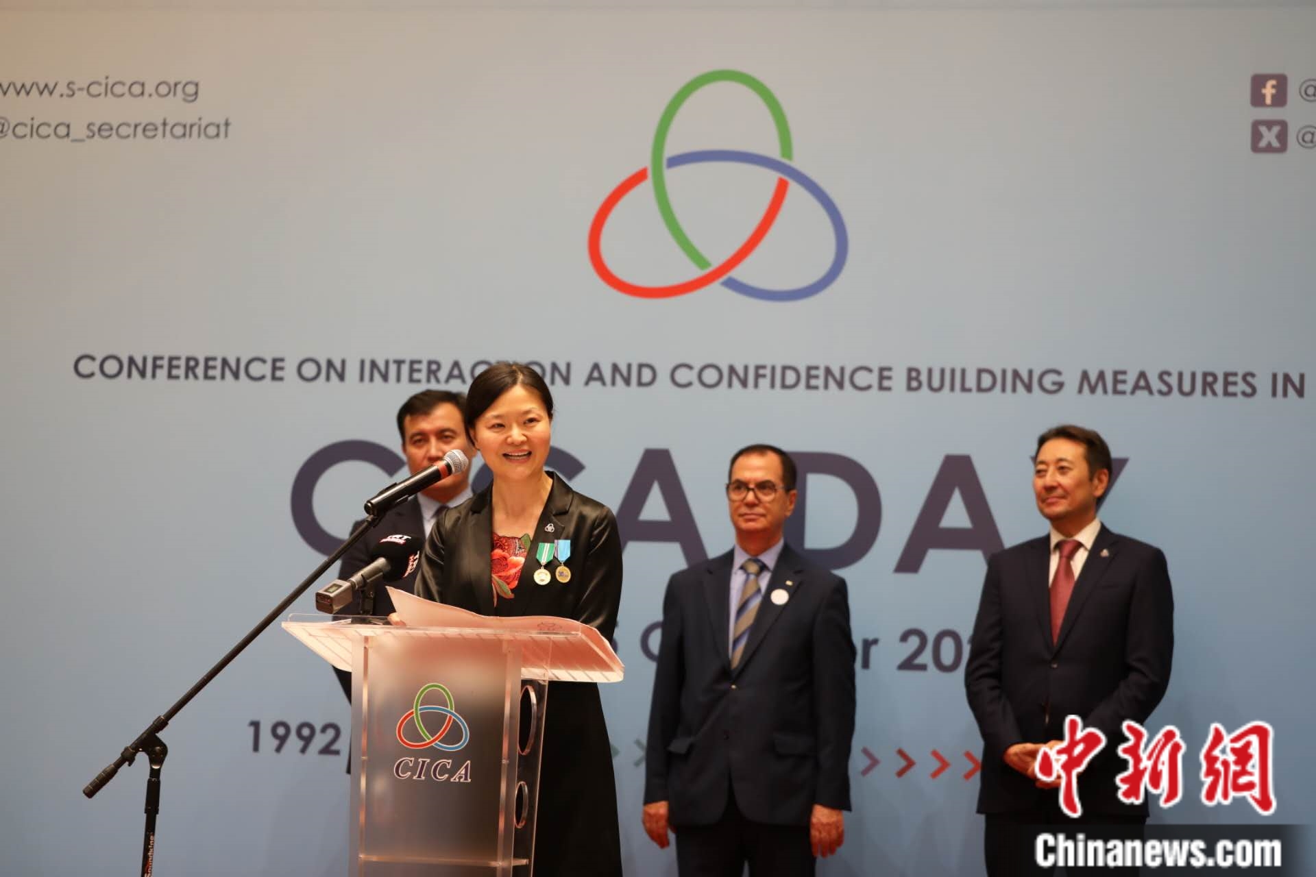 10月5日,哈薩克斯坦阿斯坦納,亞洲相互協(xié)作與信任措施會(huì)議秘書處舉辦成立31周年招待會(huì)。圖為亞信會(huì)議副秘書長遲方被授予總統(tǒng)頒發(fā)的國家獎(jiǎng)?wù)隆喰艜?huì)議秘書處供圖