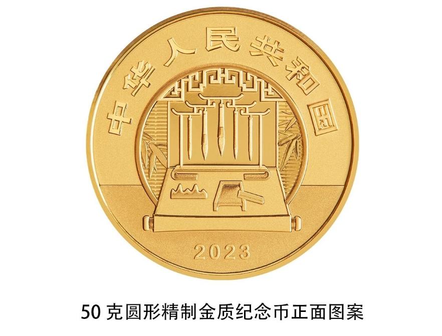 4枚圓形金銀紀念幣正面圖案均為筆、墨、紙、硯造型,輔以竹葉、窗等裝飾組合設計,并刊國名、年號。