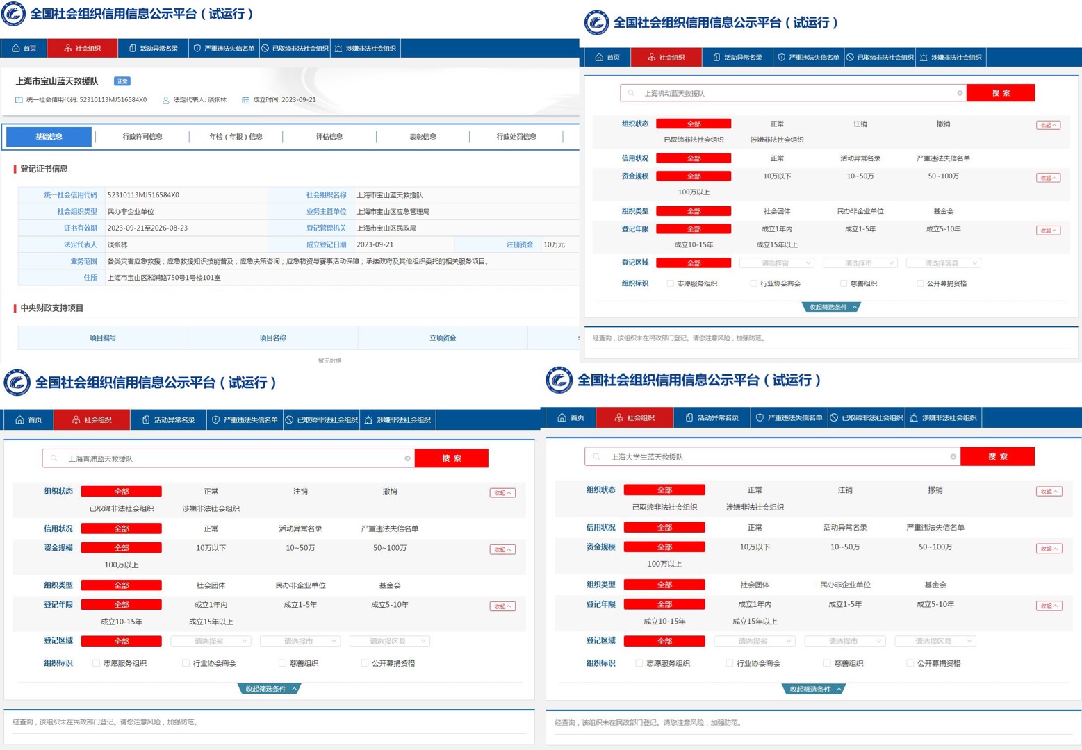 中新網(wǎng)查詢(xún)?nèi)珖?guó)社會(huì)組織信用信息公示平臺(tái)發(fā)現(xiàn),上海市寶山藍(lán)天救援隊(duì)成立登記日期為2023年9月21日,系民辦非企業(yè)單位,業(yè)務(wù)主管單位為上海市寶山區(qū)應(yīng)急管理局。其余3個(gè)組織顯示為“該組織未在民政部門(mén)登記,請(qǐng)您注意風(fēng)險(xiǎn),加強(qiáng)防范”。