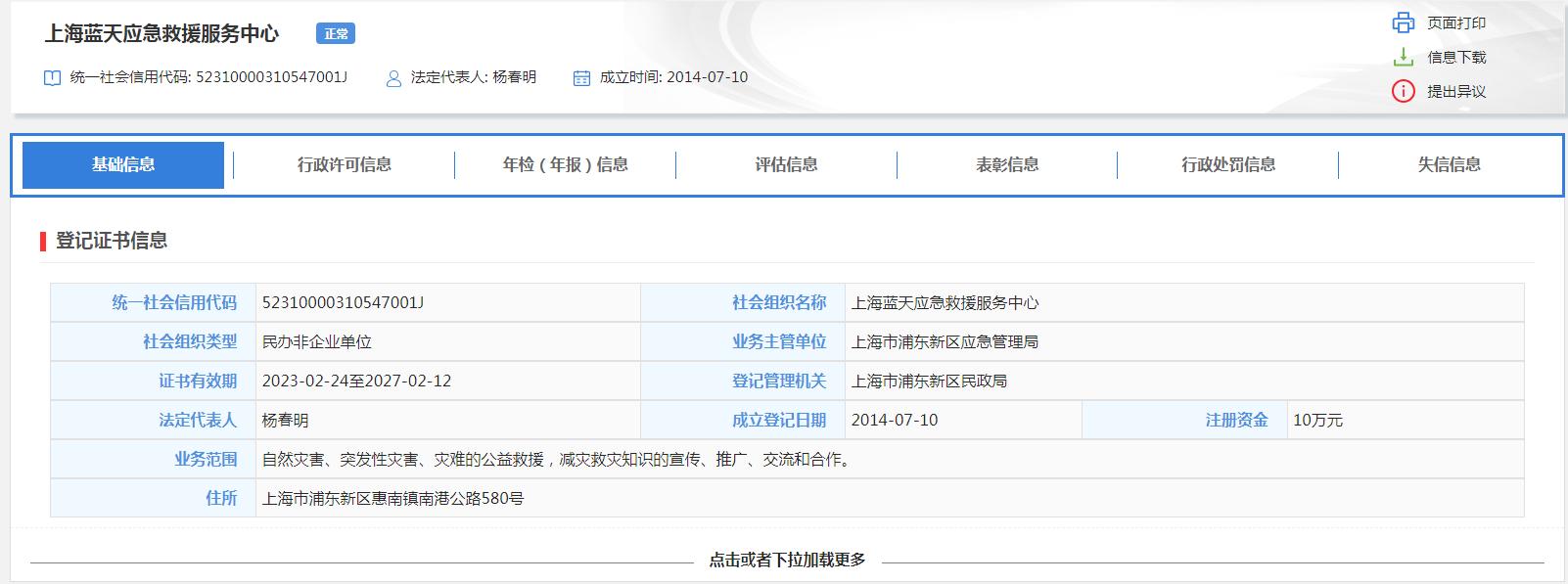 企查查信息顯示,上海藍(lán)天應(yīng)急救援服務(wù)中心成立于2014年,法人為楊春明。全國(guó)社會(huì)組織信用信息公示平臺(tái)顯示,其成立登記日期為2014年7月10日,系民辦非企業(yè)單位,登記管理機(jī)關(guān)為上海市浦東新區(qū)民政局。