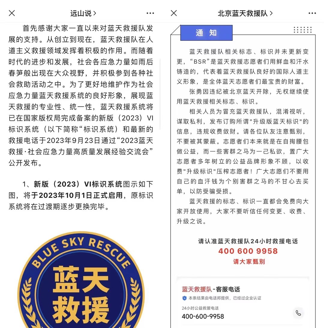 中新網(wǎng)注意到,今年9月30日,張勇在“遠(yuǎn)山說(shuō)”公眾號(hào)上發(fā)布了《藍(lán)天救援關(guān)于更換VI標(biāo)識(shí)系統(tǒng)、救援電話的公告》,稱(chēng)將于2023年10月1日正式啟用。就在啟用當(dāng)天,北京藍(lán)天救援隊(duì)公眾號(hào)發(fā)布信息稱(chēng)“藍(lán)天救援隊(duì)相關(guān)標(biāo)志、標(biāo)識(shí)并未更新變更。不要聽(tīng)信任何變更、收費(fèi)、升級(jí)之說(shuō)?!?/p>