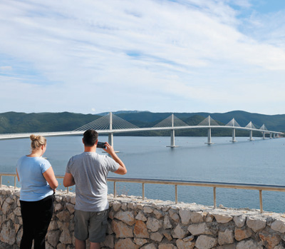 沿著克羅地亞狹長(zhǎng)的海岸線一路向南行駛到科馬爾納地區(qū),遠(yuǎn)遠(yuǎn)就能望見(jiàn)如銀鏈般橫臥在山海之間的佩列沙茨大橋。在橋頭一側(cè)的休息區(qū),人們紛紛停下車來(lái),對(duì)著大橋拍照留念。來(lái)自克羅地亞北部的卡塞爾和朋友們特地自駕來(lái)到這里,開(kāi)心地請(qǐng)本報(bào)記者幫忙合影?!芭辶猩炒拇髽蜻B通了克羅地亞南北領(lǐng)土,是我們心中最美的大橋!”卡塞爾說(shuō)。