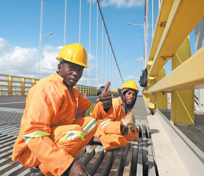 當(dāng)?shù)毓と嗽趯?duì)莫桑比克馬普托大橋進(jìn)行日常維護(hù)。