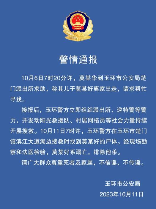 中新網10月11日電 浙江省玉環(huán)市公安局11日在其官方微信發(fā)布警情通報稱,10月6日7時20分許,莫某華到玉環(huán)市公安局楚門派出所求助,稱其兒子莫某好離家出走,請求幫忙尋找。