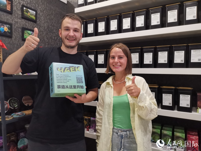 馬克西姆和妻子達(dá)麗婭在圣彼得堡茶葉店內(nèi)展示產(chǎn)品。人民網(wǎng)記者 楊倩攝