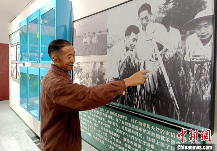 10月13日,在安江農(nóng)校紀(jì)念園內(nèi)的雜交水稻發(fā)源地紀(jì)念館,袁隆平的學(xué)生宋澤觀講述袁隆平及其團(tuán)隊(duì)研究雜交水稻的故事。中新社記者 鄧霞 攝