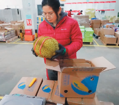 兩個多小時后,在北京市海淀區(qū)的一個快遞站點(diǎn),京東快遞員侯建東從傳送帶上拿到了一箱榴蓮。
