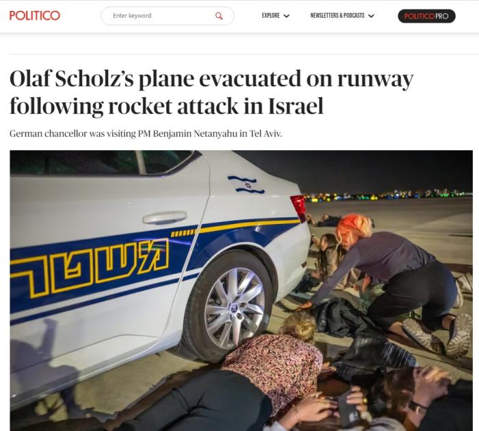 當?shù)貢r間17日晚,德國總理朔爾茨在以色列本古里安機場登機前突遇火箭彈襲擊,人員緊急躲避。圖片來源:美國政治新聞網(wǎng)報道截圖