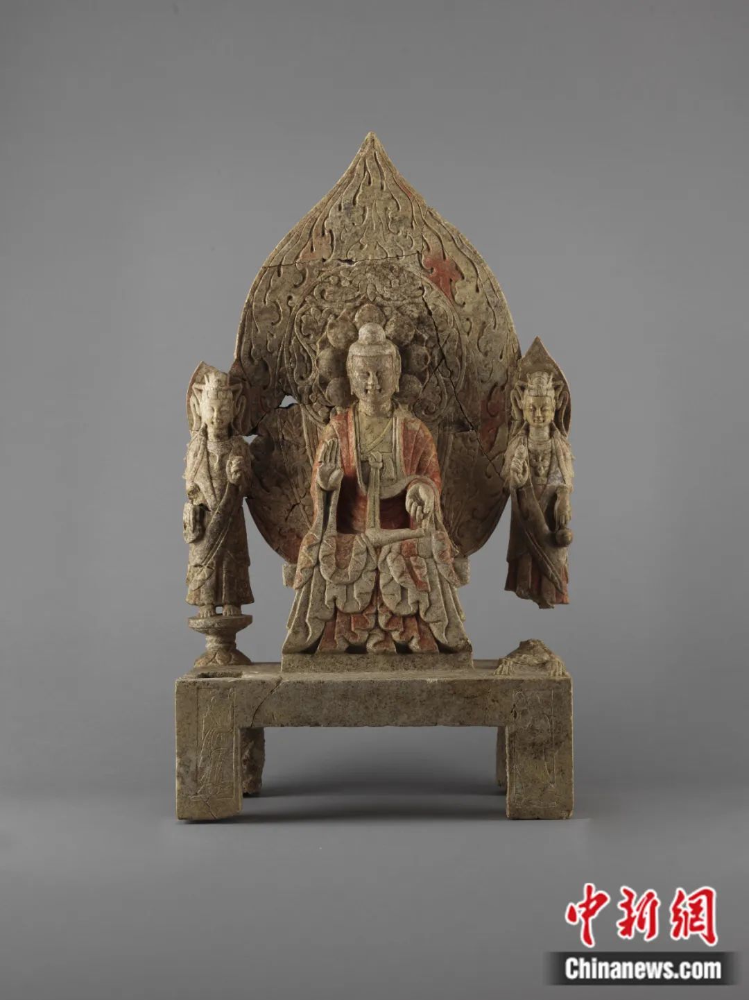 何利群:“譚副造釋迦像”殘高1.28米,主尊高77.7厘米,青石材質(zhì),是一尊一佛二菩薩背屏式造像,通體彩繪貼金。它由數(shù)十件碎塊拼接綴合而成,是鄴城地區(qū)出土?xí)r代最早的北魏造像之一,也是其中形體較大的一件。