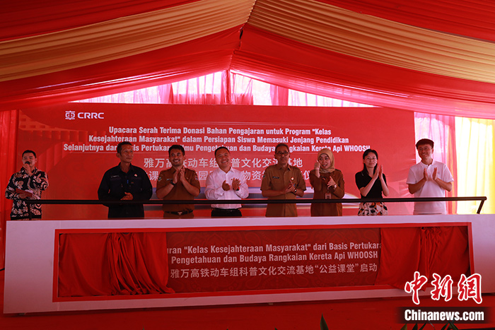 當(dāng)?shù)貢r間10月24日,雅萬高鐵動車組科普文化交流基地公益課堂進(jìn)校園暨教學(xué)物資捐贈交接儀式在印尼萬隆岸普拉第三國立初級中學(xué)舉行,這是中國高鐵公益課堂首次走進(jìn)印尼校園。圖為儀式啟動現(xiàn)場。 中新社記者 李志全 攝