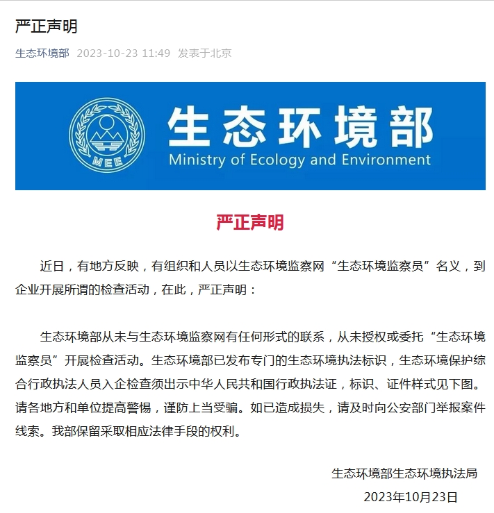 中新網(wǎng)10月23日電 據(jù)生態(tài)環(huán)境部公眾號(hào)10月23日消息,近日,有地方反映,有組織和人員以生態(tài)環(huán)境監(jiān)察網(wǎng)“生態(tài)環(huán)境監(jiān)察員”名義,到企業(yè)開(kāi)展所謂的檢查活動(dòng),在此,生態(tài)環(huán)境部嚴(yán)正聲明: