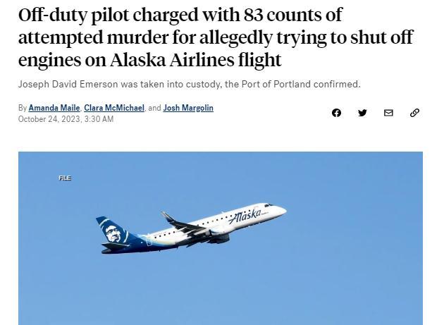 中新網(wǎng)10月24日電 綜合美媒24日報道,美國官員透露,近日,美國阿拉斯加航空一趟航班遭遇了一起驚險事件,一名未當(dāng)班的飛行員試圖在飛行途中關(guān)閉發(fā)動機(jī)。目前,這名飛行員已被控83項謀殺未遂罪名。