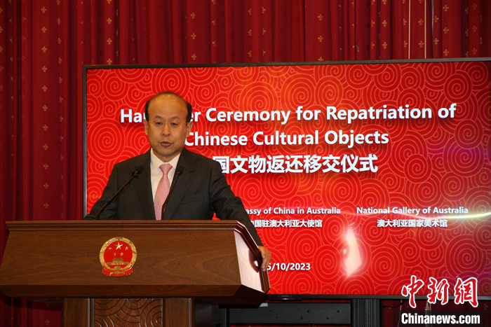 當(dāng)?shù)貢r(shí)間10月25日上午,經(jīng)中國(guó)國(guó)家文物局授權(quán),中國(guó)駐澳大利亞大使館在堪培拉舉行儀式,接收澳方向中國(guó)返還共4件流失文物藝術(shù)品與1件古生物化石。中國(guó)駐澳大利亞大使肖千在致辭中表示,這些文物回歸祖國(guó),顯示了中澳兩國(guó)政府對(duì)于保護(hù)文化遺產(chǎn)的共同承諾,是雙方文化遺產(chǎn)交流的一次盛事和友好合作的見(jiàn)證。 中新社記者 顧時(shí)宏 攝