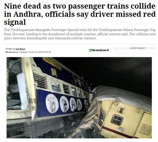 據(jù)報道,當(dāng)天,一列從安得拉邦的維薩卡帕特南開往奧迪沙邦的客運(yùn)列車,與同軌道上從維薩卡帕特南駛向帕拉薩的客運(yùn)列車相撞,事故造成數(shù)節(jié)車廂脫軌。