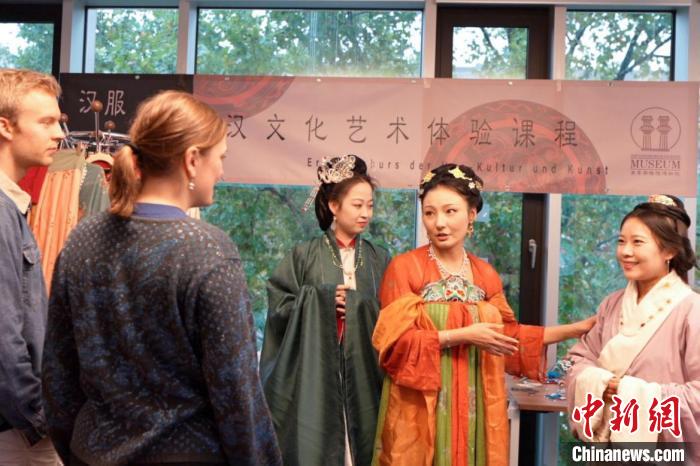 圖為德國學(xué)生身著漢服參與漢文化體驗課程,學(xué)習(xí)漢服文化。漢文化藝術(shù)交流中心供圖