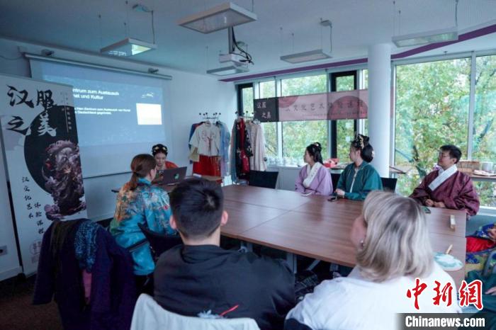 圖為活動講師為德國學(xué)生介紹漢制漢服特點。漢文化藝術(shù)交流中心供圖。