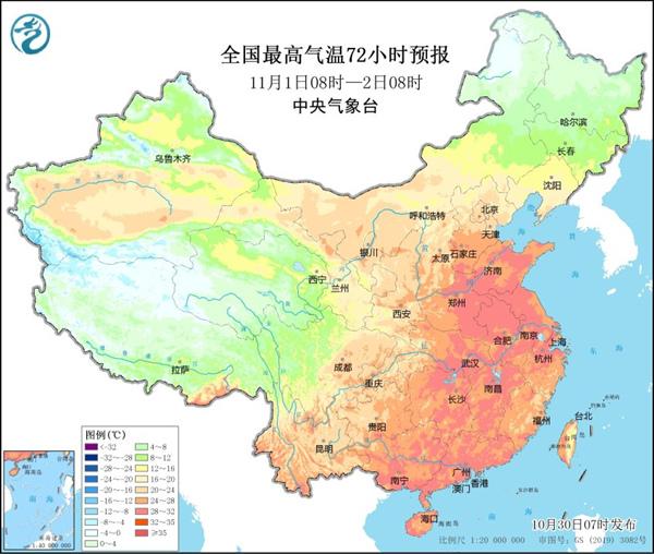 本周前期,中東部升溫還將繼續(xù)。 預(yù)計(jì)本周初,全國大部仍會(huì)以升溫為主,并且大幅偏離常態(tài)。特別是華北、黃淮一帶,11月初暖熱程度還會(huì)升級(jí),部分地區(qū)最高氣溫甚至?xí)^30℃部分,比如,鄭州,菏澤等地可能在11月1日前后迎來當(dāng)?shù)?1月觀測史上的首個(gè)30℃。