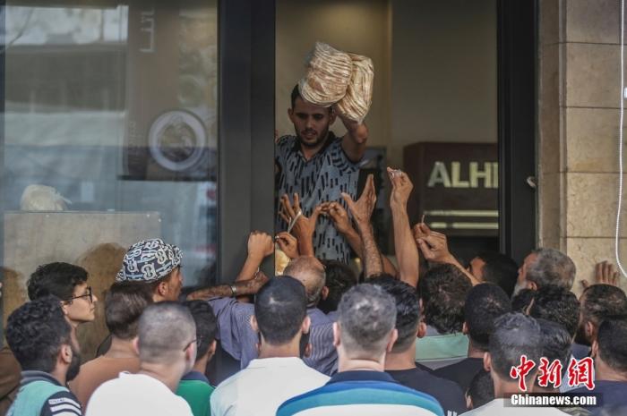 當?shù)貢r間10月17日,加沙地帶南部城市汗尤尼斯,巴勒斯坦公民聚集在一家面包店前搶購面包。