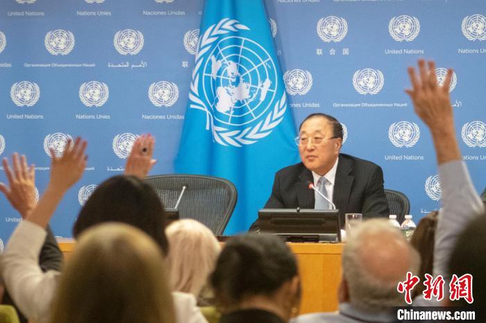 當(dāng)?shù)貢r間11月1日,中國常駐聯(lián)合國代表張軍在紐約聯(lián)合國總部向媒體吹風(fēng),介紹中方擔(dān)任安理會輪值主席的工作考慮。圖為現(xiàn)場媒體舉手提問。中新社記者 王帆 攝