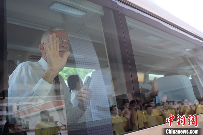 圖為臨別時,代表團成員與學(xué)生揮手告別。 中新社記者 劉俊聰 攝