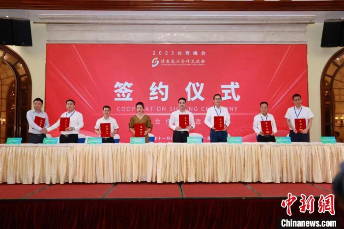 11月7日,2023臺商峰會瓊臺農(nóng)業(yè)合作交流會在海南澄邁舉行。圖為相關(guān)機(jī)構(gòu)和企業(yè)在會上進(jìn)行投資合作框架協(xié)議簽約。海南省農(nóng)業(yè)交流協(xié)會供圖