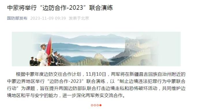 中新網(wǎng)11月9日電 據(jù)國防部發(fā)布微信公眾號(hào)消息,根據(jù)中蒙年度邊防交往合作計(jì)劃,11月10日,兩軍將在新疆昌吉回族自治州附近的中蒙邊界地區(qū)舉行“邊防合作-2023”聯(lián)合演練,以“制止邊境違法犯罪行為中蒙聯(lián)合行動(dòng)”為課題,旨在提升兩國邊防部隊(duì)聯(lián)合打擊邊境走私和恐怖破壞活動(dòng),共同維護(hù)邊境地區(qū)和平與安寧的能力,進(jìn)一步深化兩軍務(wù)實(shí)交流合作。