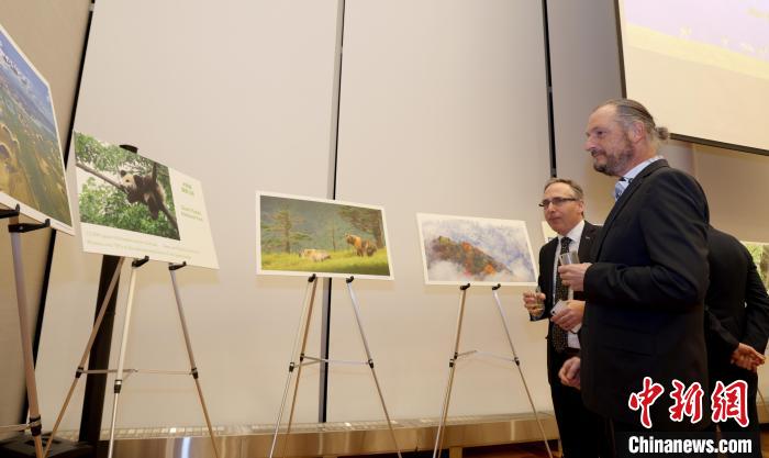 當(dāng)?shù)貢r間11月8日,中國駐加拿大使館舉辦國家公園圖片展暨招待會。圖為與會嘉賓觀看大熊貓國家公園照片。中新社記者 余瑞冬 攝