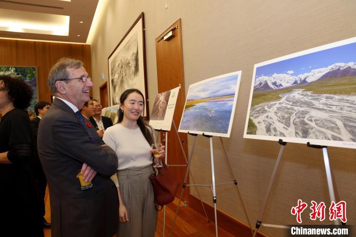 當(dāng)?shù)貢r間11月8日,中國駐加拿大使館舉辦國家公園圖片展暨招待會。圖為與會嘉賓觀看三江源國家公園照片。 中新社記者 余瑞冬 攝