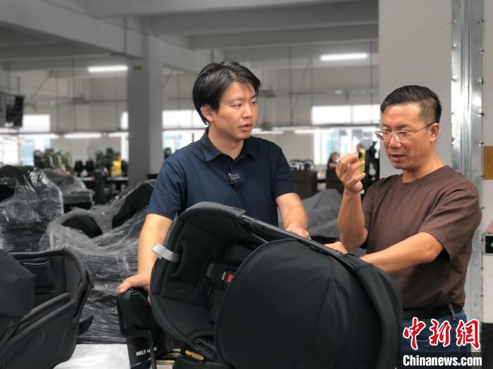 10月17日,臺(tái)灣青年楊博弘(左一)在惠州工廠詢問嬰童安全座椅生產(chǎn)情況。中新社記者 孫秋霞 攝