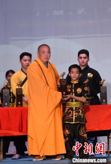 當(dāng)?shù)貢r(shí)間11月12日下午,由中國(guó)嵩山少林寺主辦的“不朽少林”少林功夫公演在已有逾百年歷史的美國(guó)洛杉磯Million Dollar劇院舉行。圖為嵩山少林寺方丈釋永信向“北美洲少林考功大賽”獲獎(jiǎng)?wù)哳C獎(jiǎng)?!≈行律缬浾? 張朔 攝