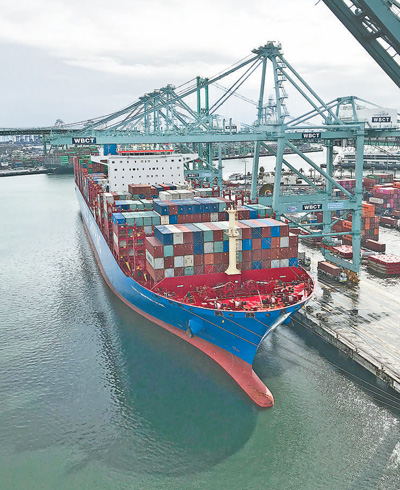 中遠(yuǎn)海運(yùn)集團(tuán)的遠(yuǎn)洋運(yùn)輸船舶停靠在美國洛杉磯港西港池集裝箱碼頭。
