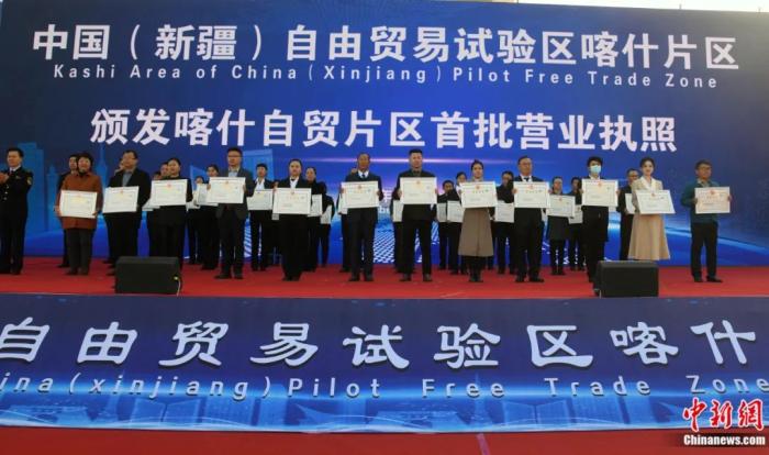 2023年11月11日,中國(新疆)自由貿(mào)易試驗區(qū)喀什片區(qū)揭牌。圖為首批入駐自貿(mào)片區(qū)的經(jīng)營主體獲頒營業(yè)執(zhí)照。孫亭文 攝