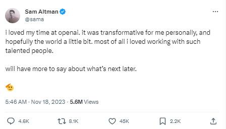 當(dāng)?shù)貢r(shí)間18日,奧特曼在社交平臺表示,“我很喜歡OpenAI的時(shí)光,這對我個(gè)人來說是變革性的,也希望通過重塑世界帶來一些變革。最重要的是,我喜歡與這些才華橫溢的人一起工作。”